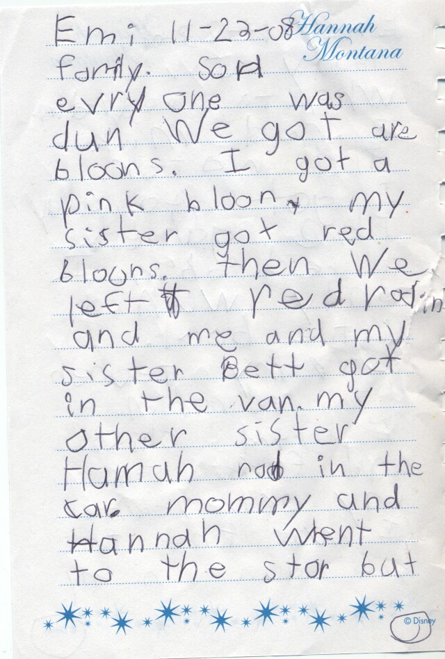 family. Soon everyone was done. We got our balloons. I got a pink balloon, my sisters got red balloons. Then we left Red Robin and me and my sister Bett got in the van. My other sister Hannah road in the car. Mommy and Hannah went to the store but |